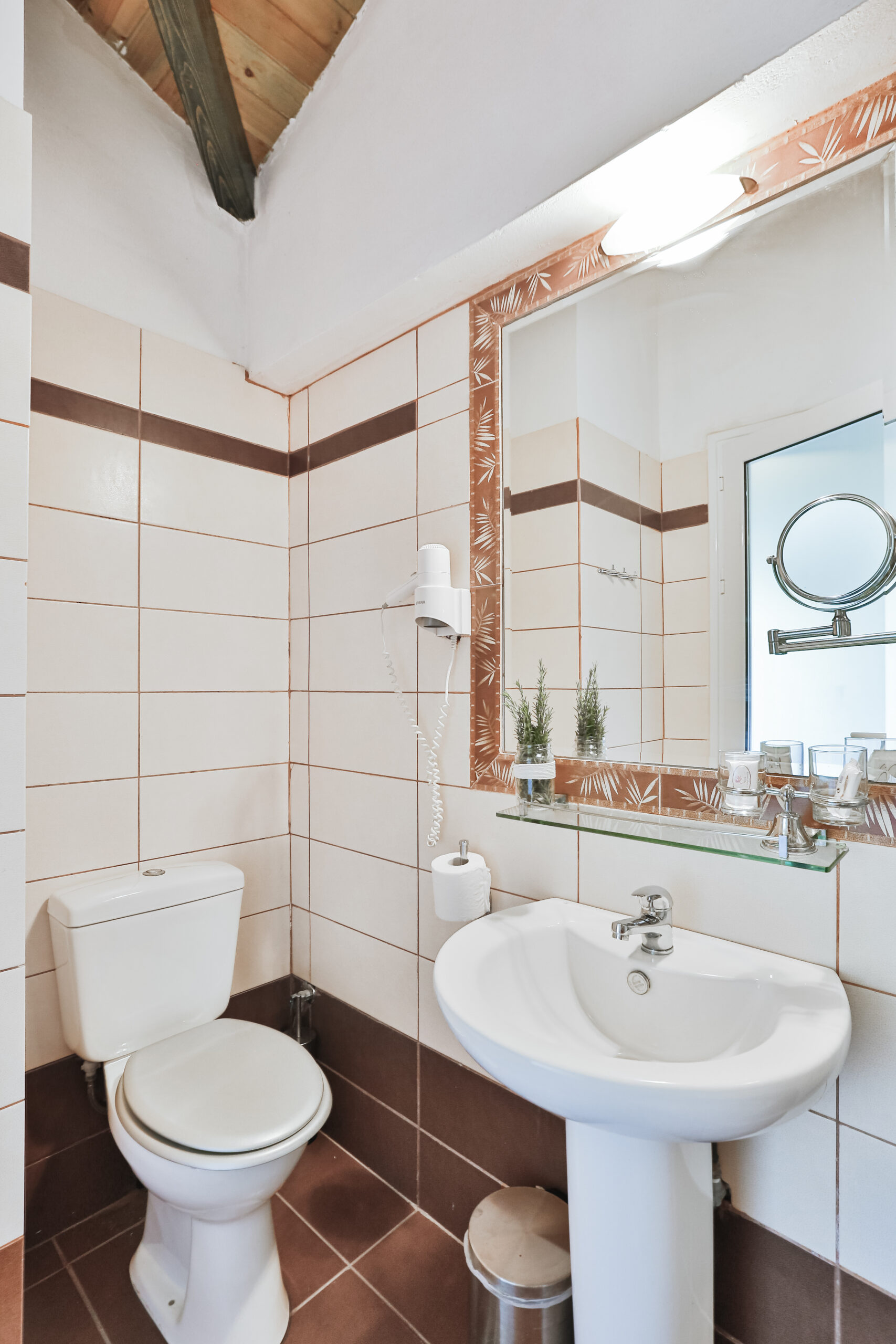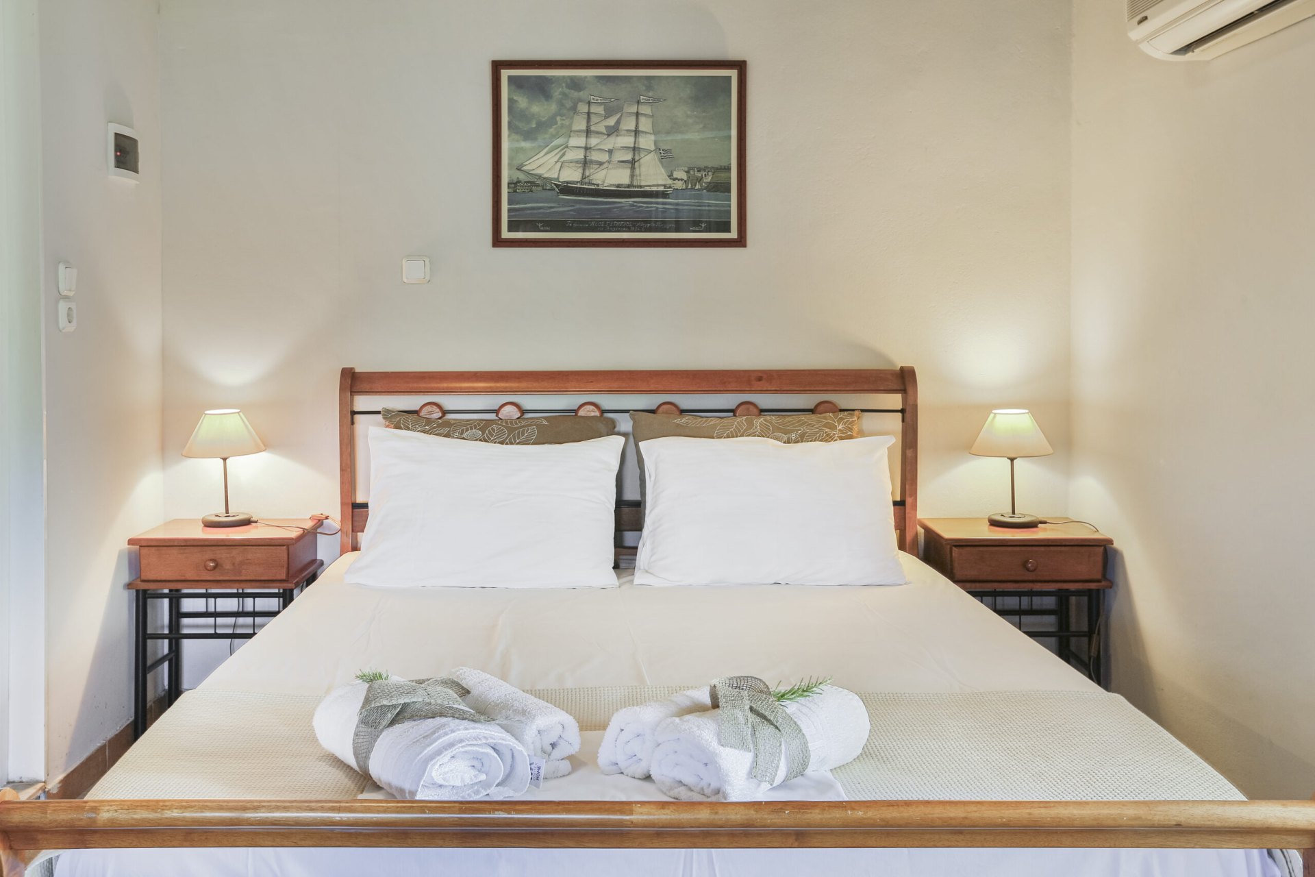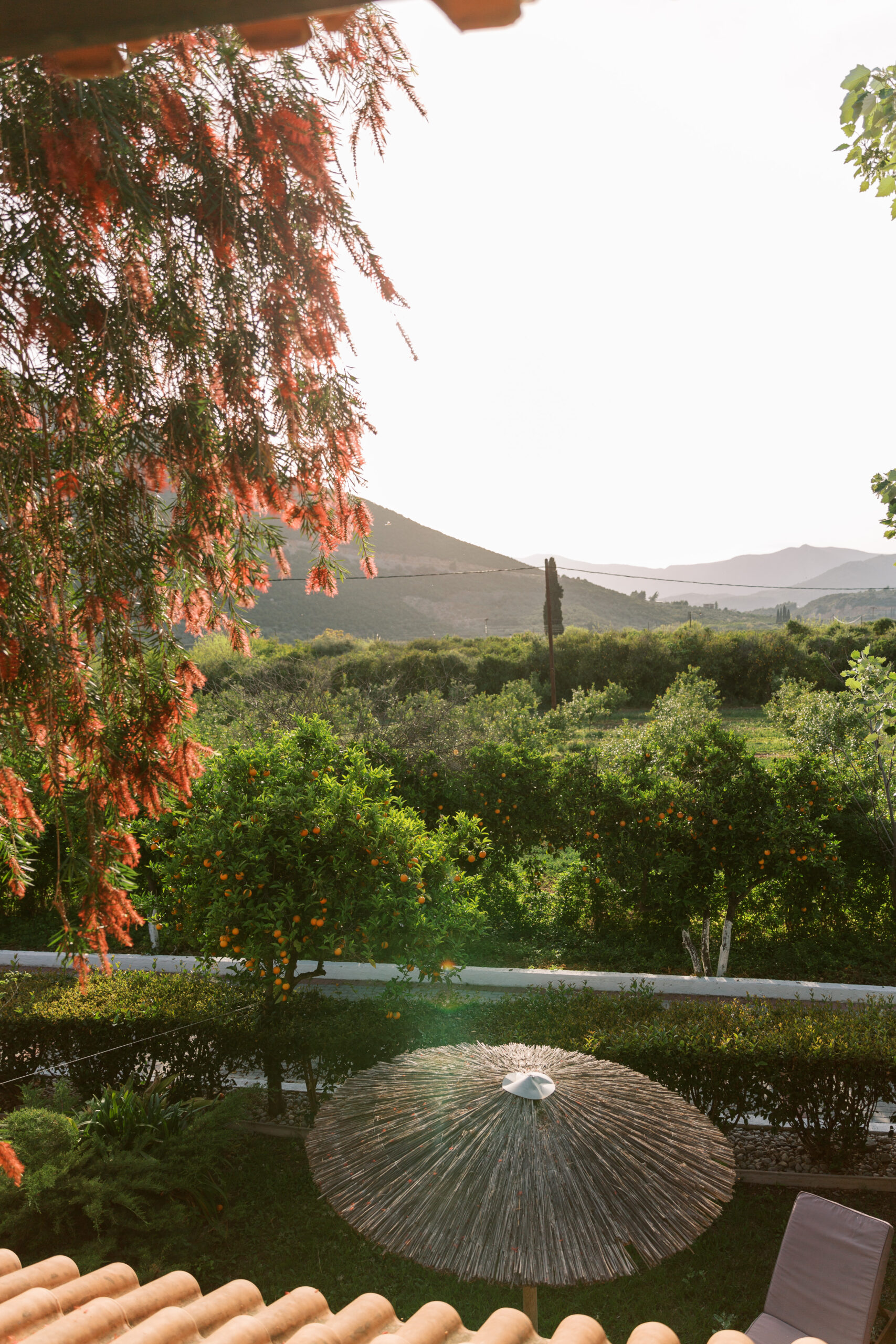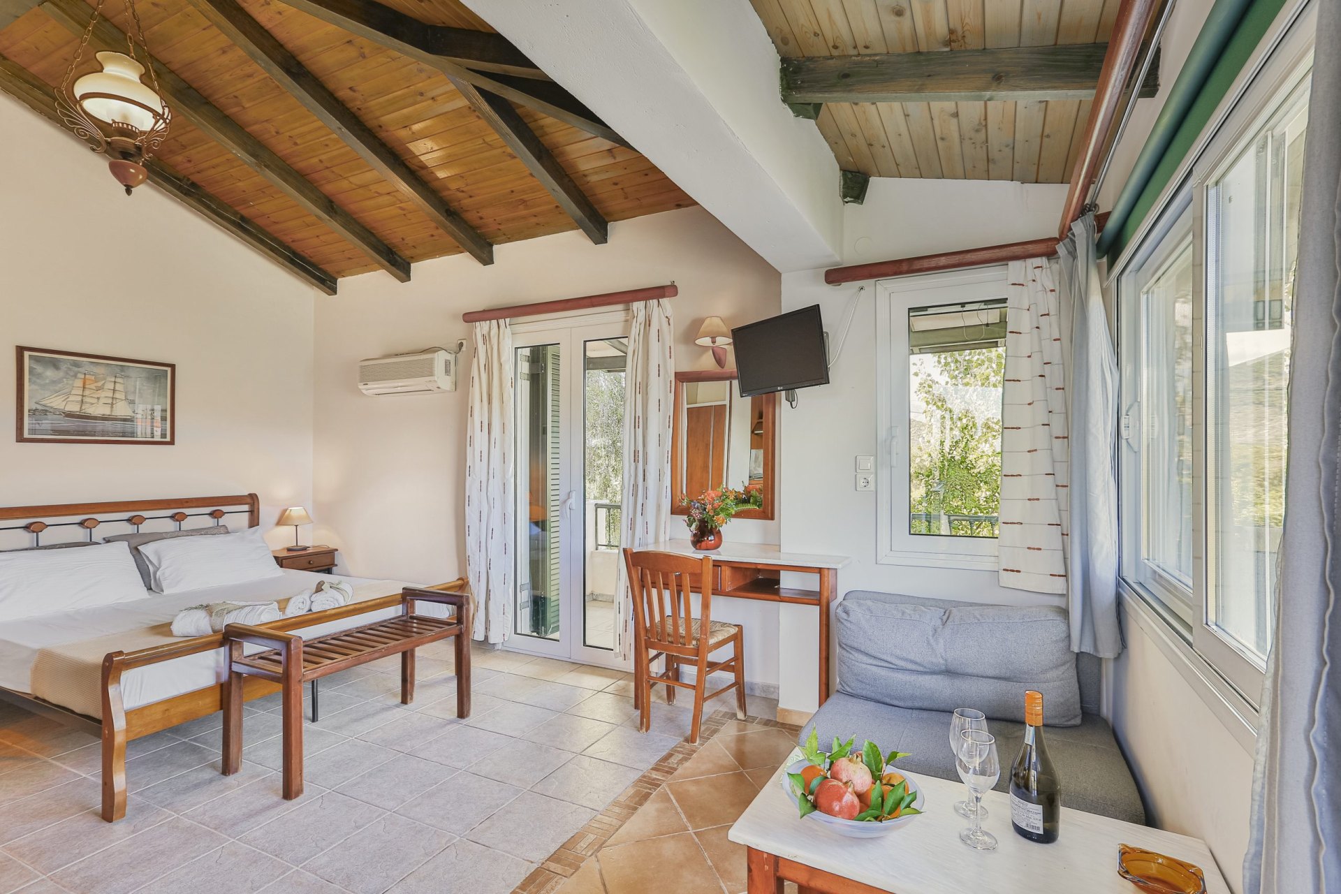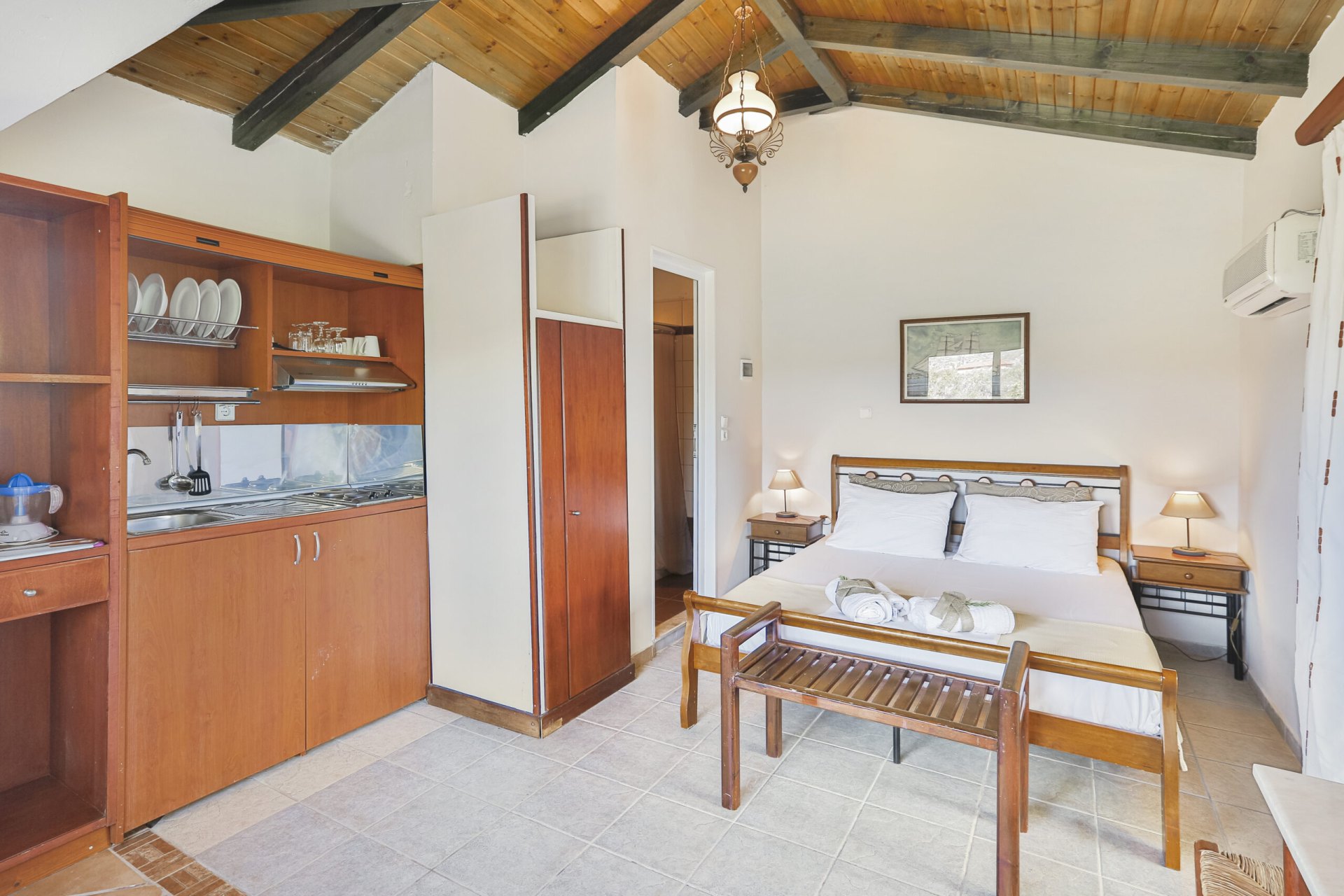 This smaller studio can host up to 2 adults and 1 child. It is located on the upper floor with a nice private balcony and a lovely view over the orange fields.